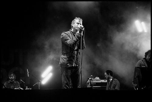 Os dois pares de irmãos sobem ao palco acompanhados de Newsome (tipo das teclas, do violino e outras sonoridades). Engravatado e soturno, Matt Berninger é o último. Agarra-se ao microfone. Como a uma mulher. Como quem faz amor.